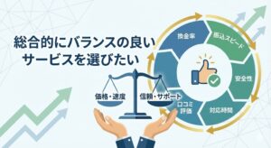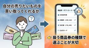 チケリアは先述の通り取扱券種が2種類のみ(百貨店商品券・VJA)。バイチケとリセチケは全国百貨店商品券と収入印紙が対象なので、用途のない収入印紙を現金化したい場合などに便利です。シープチケットは取扱商品が最も多く、JCB・UCギフト券や切手までOKです。「他社で断られた金券がシープチケットなら売れた」というケースもあります。ご自身がお持ちの金券がどの業者に適しているか、比較表の「買取対象」を改めて確認してください。